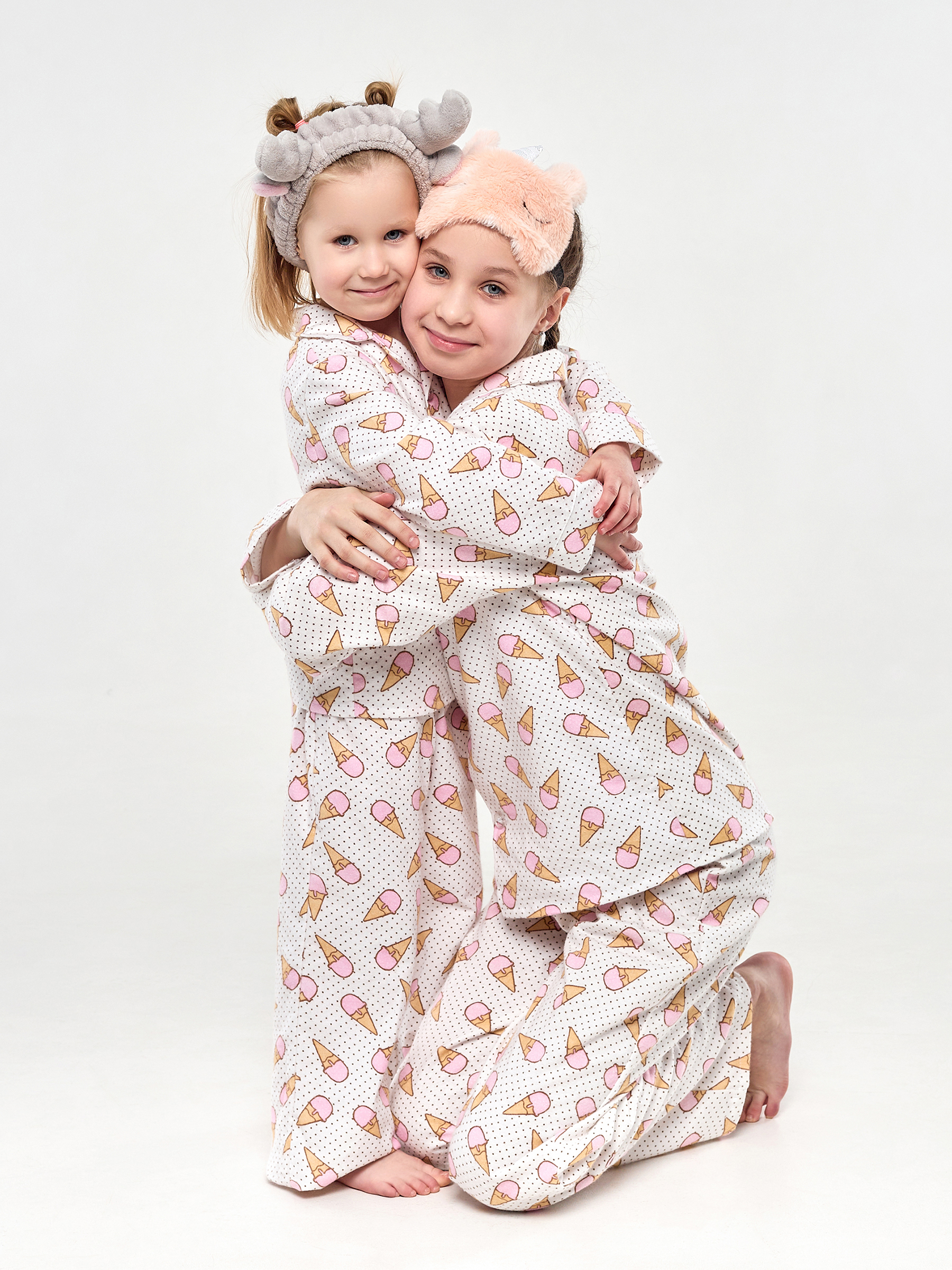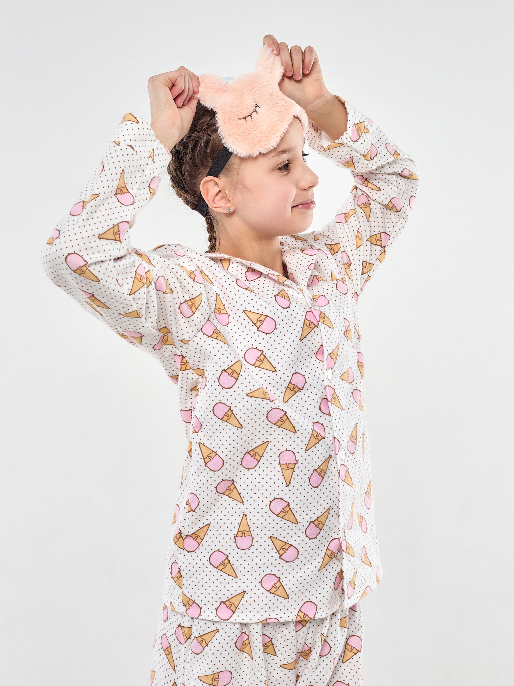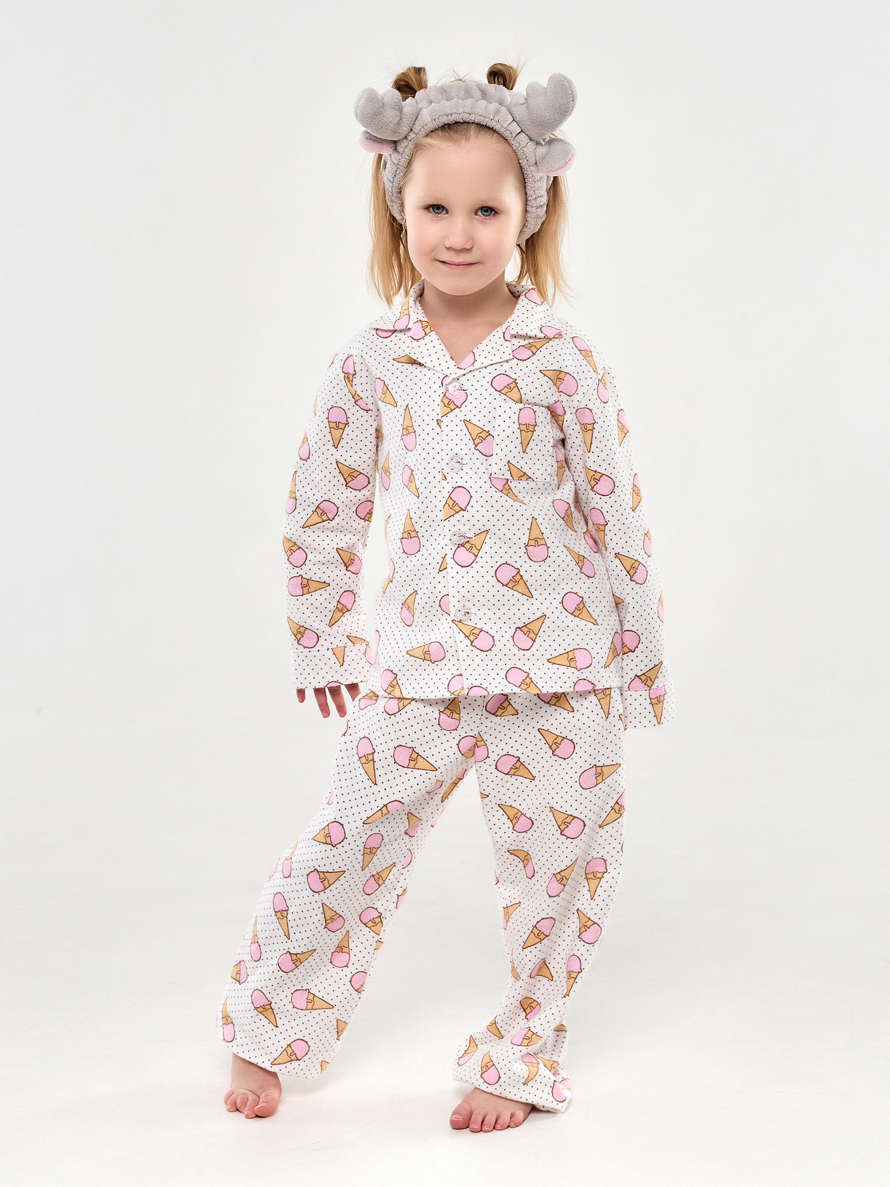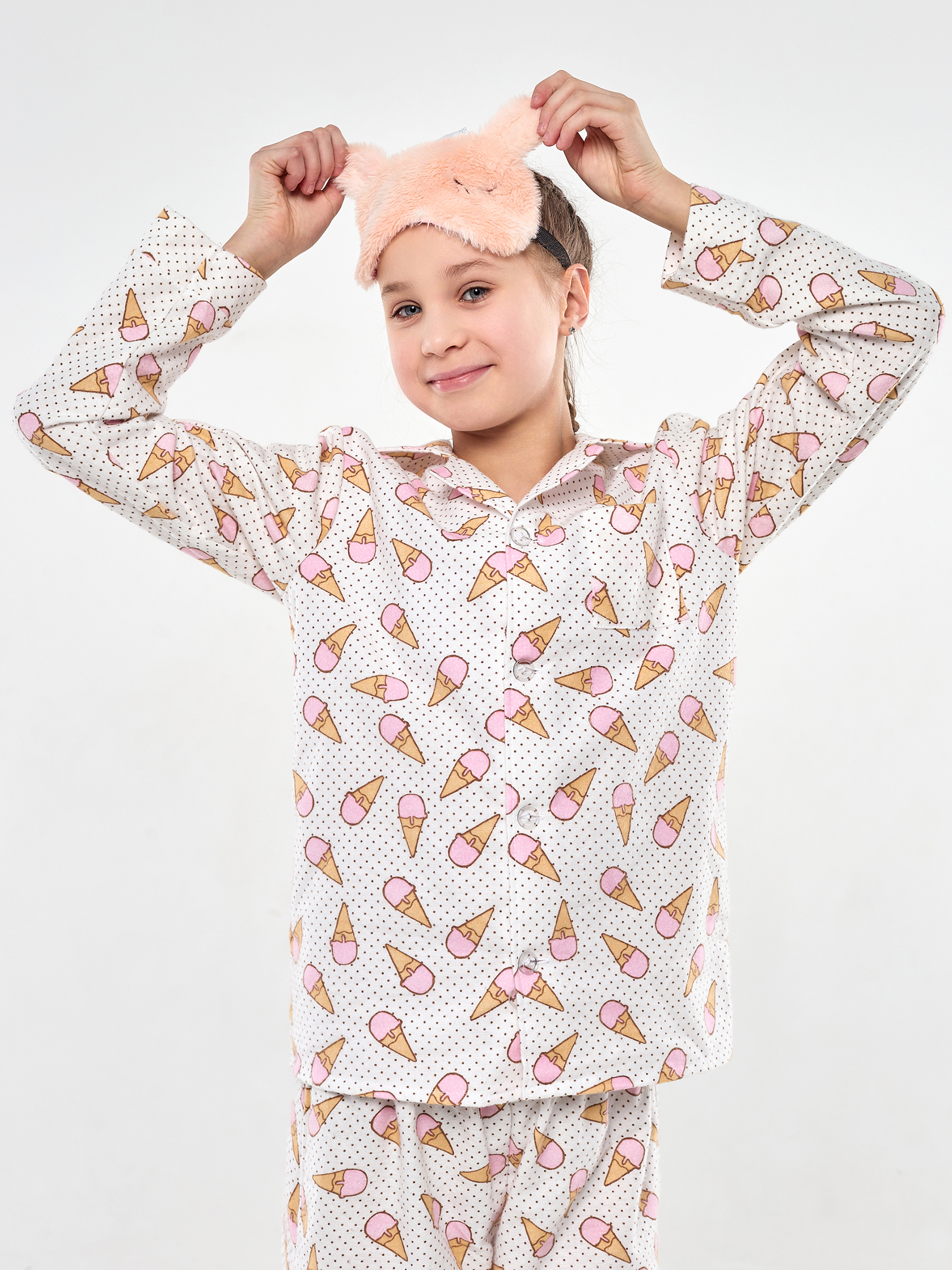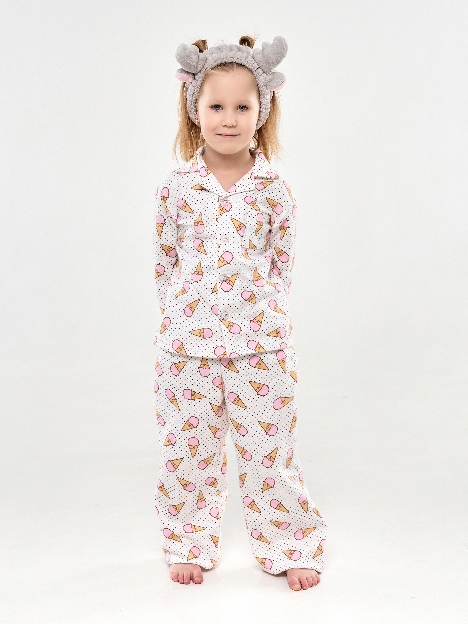 Пижама детская свободного кроя не будет стеснять движения во время активных, а также спокойных игр дома, состоит из длинных свободных штанов на резинке и рубашки с длинным рукавом на пуговицах.
