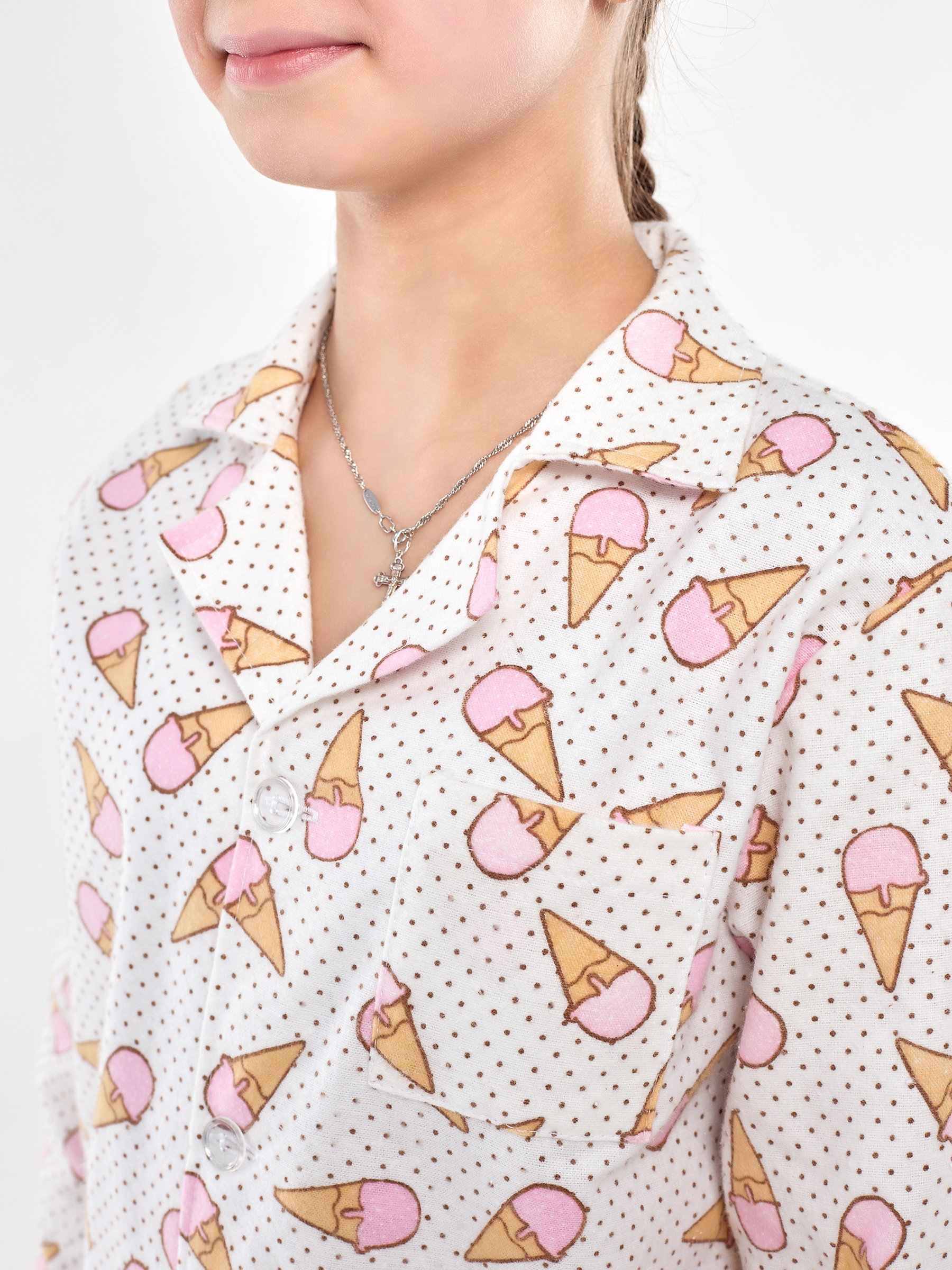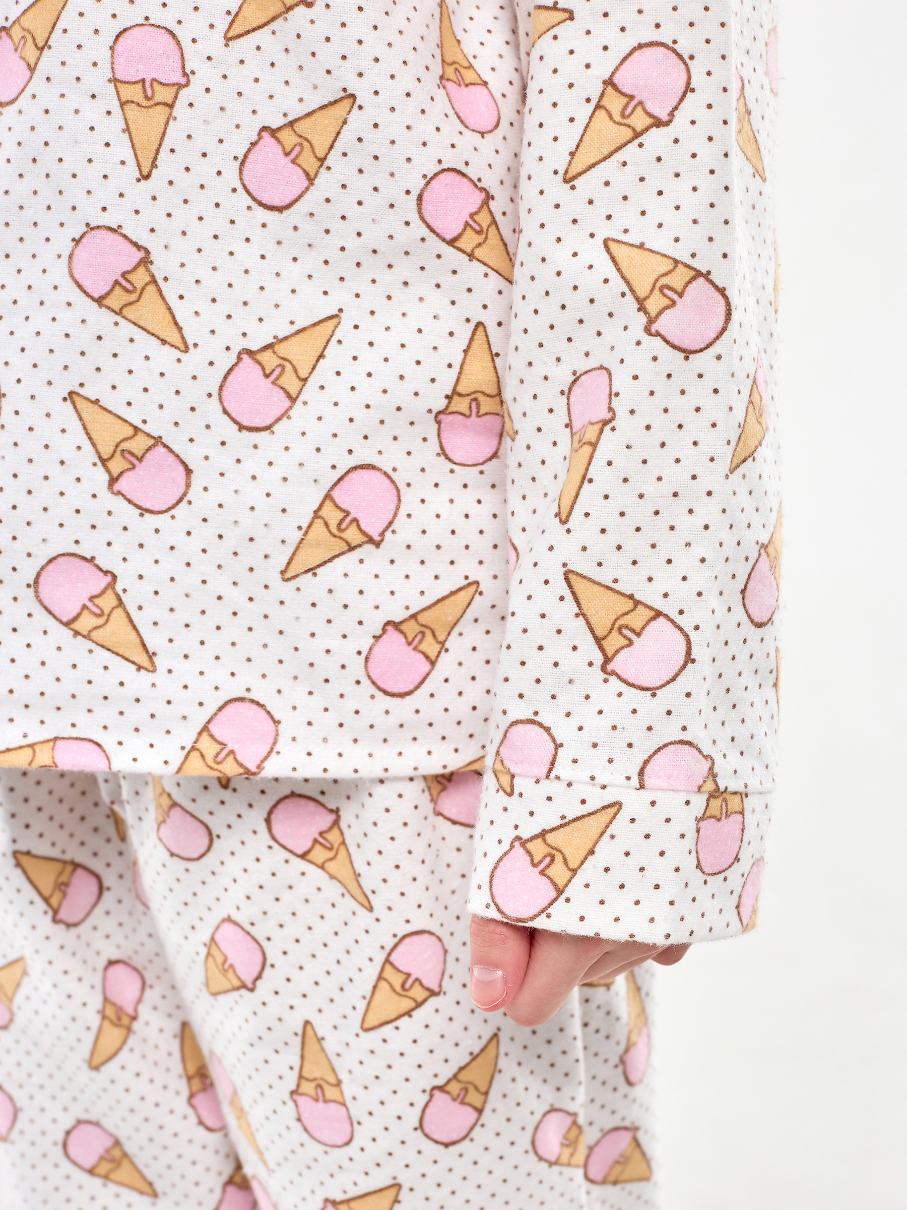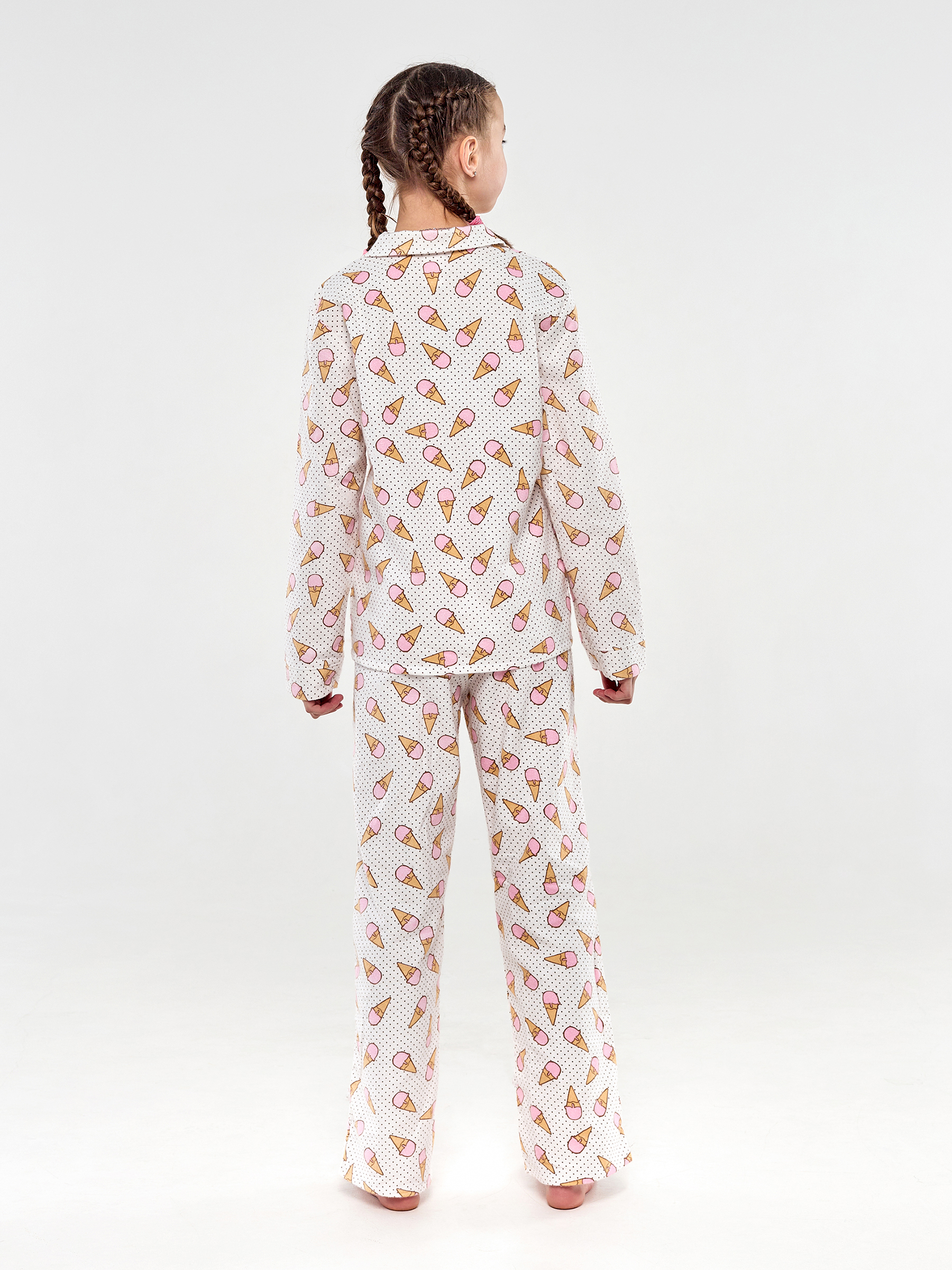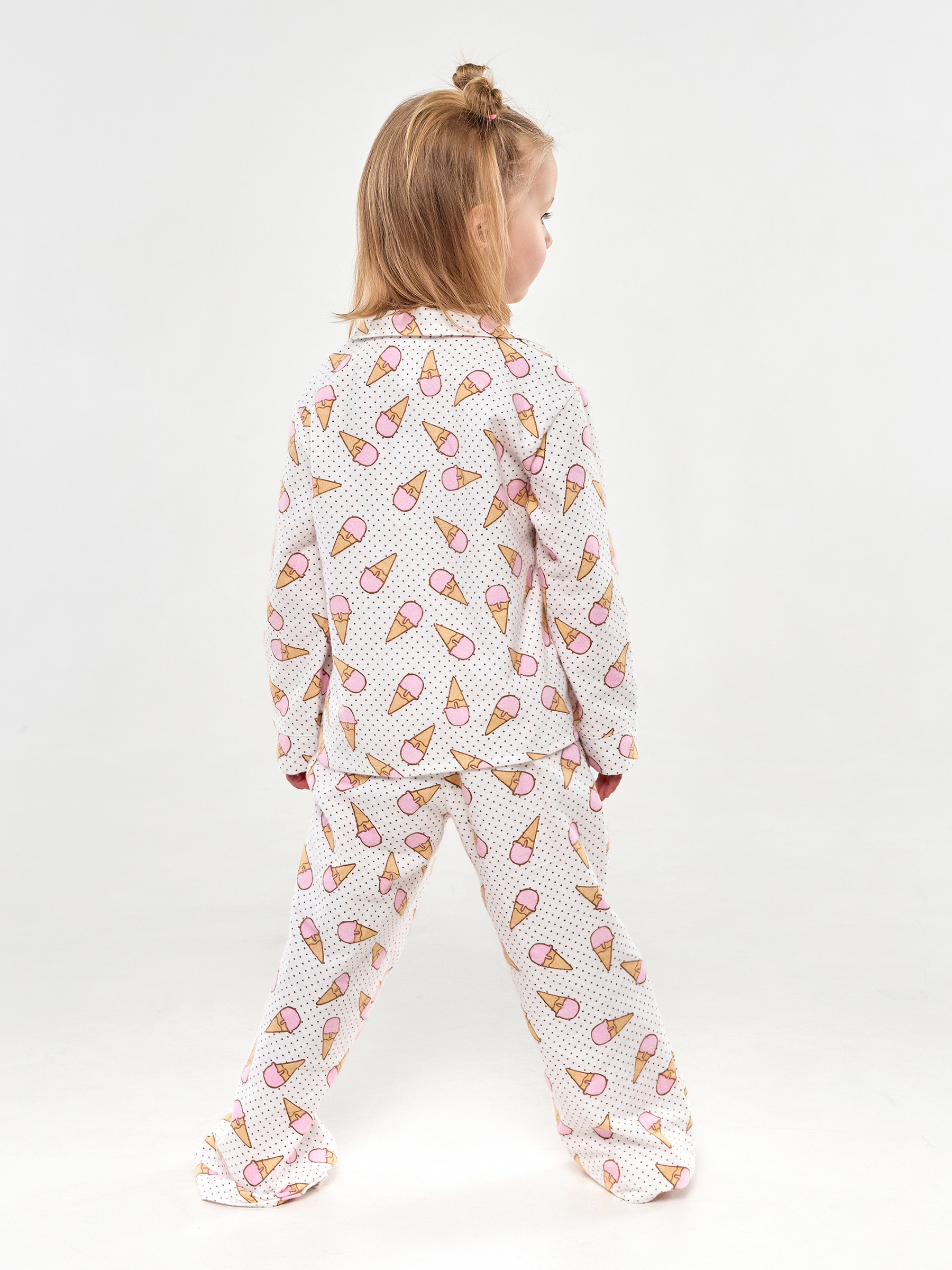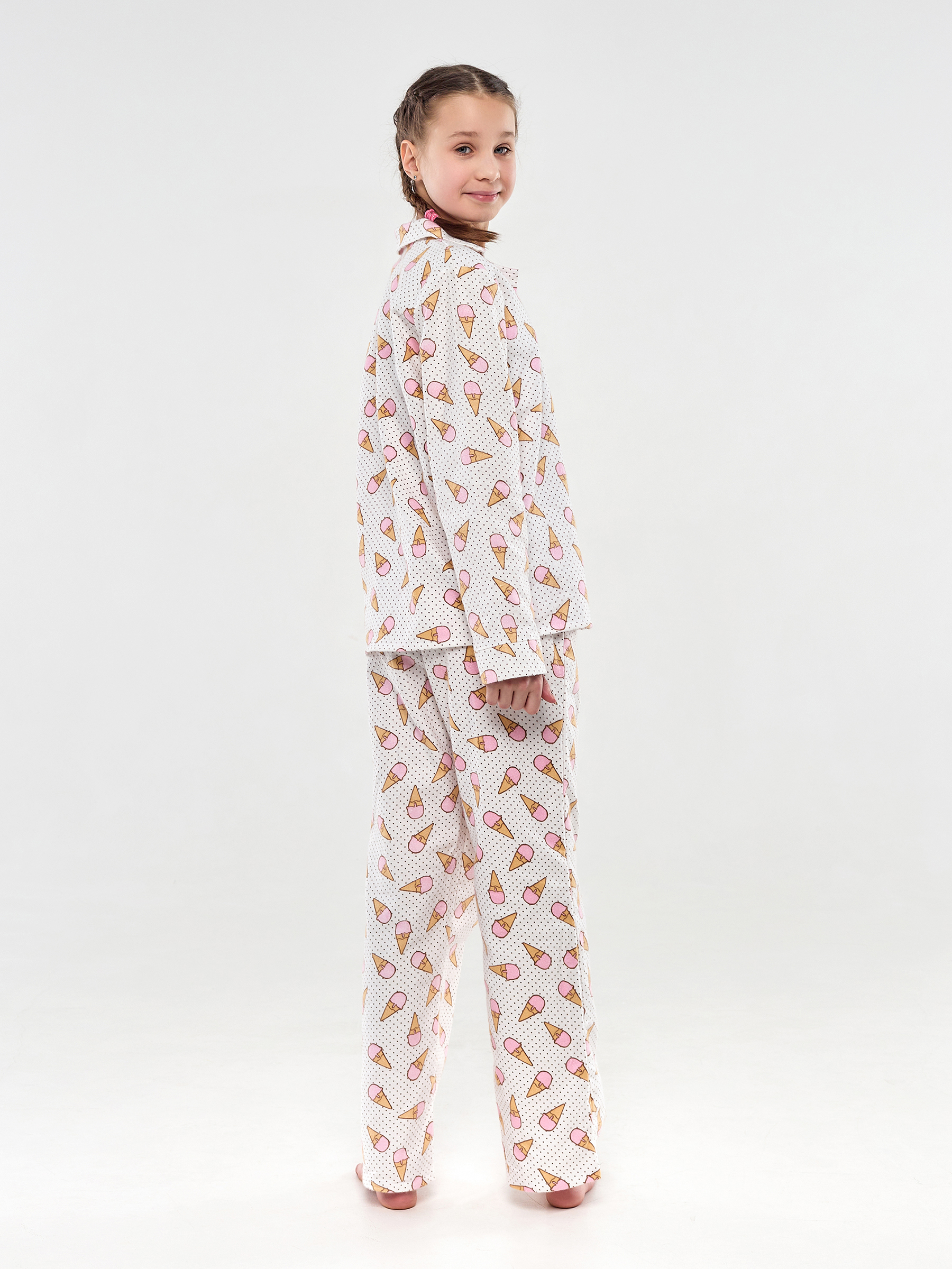 Пижама детская свободного кроя не будет стеснять движения во время активных, а также спокойных игр дома, состоит из длинных свободных штанов на резинке и рубашки с длинным рукавом на пуговицах.