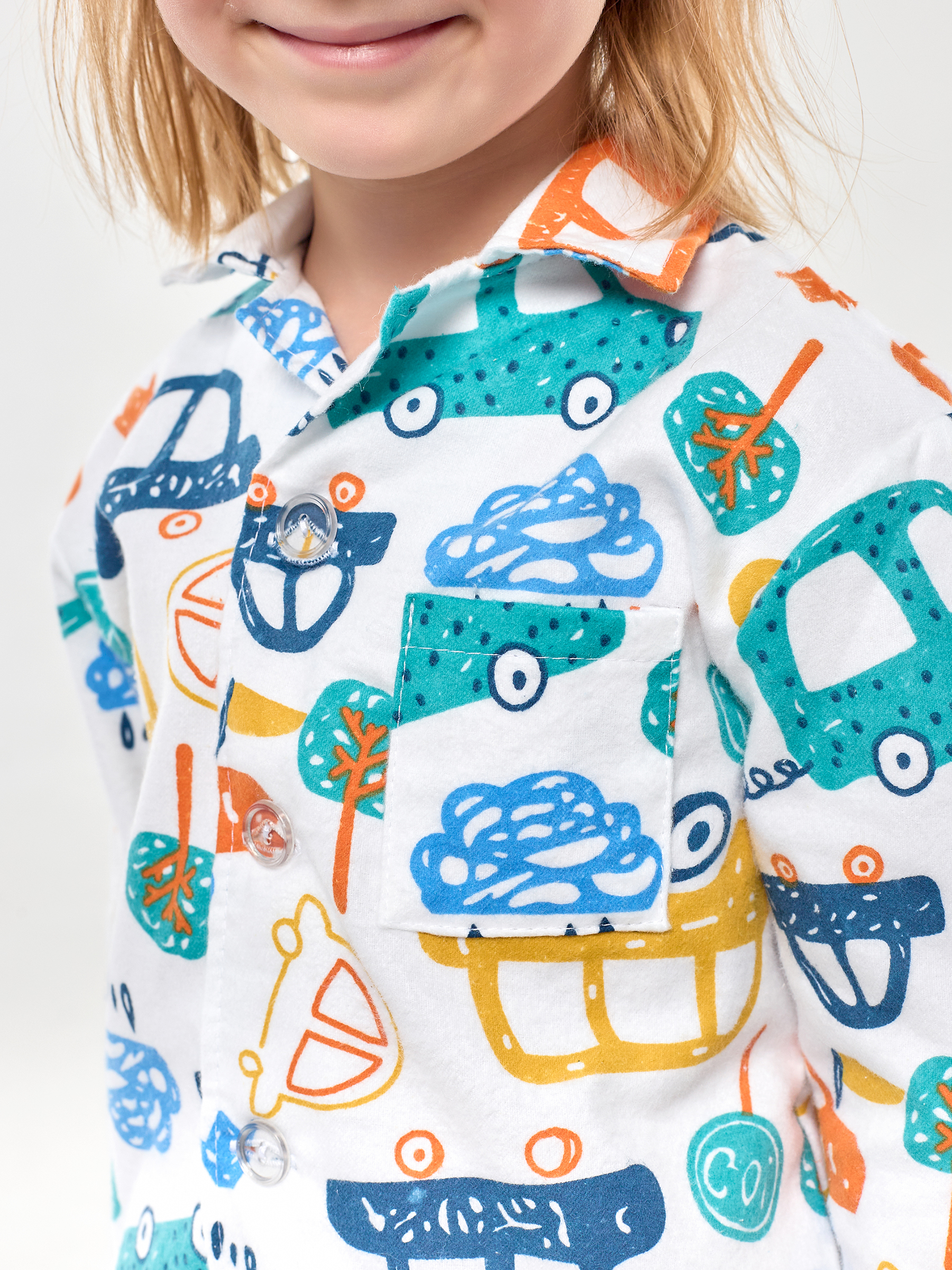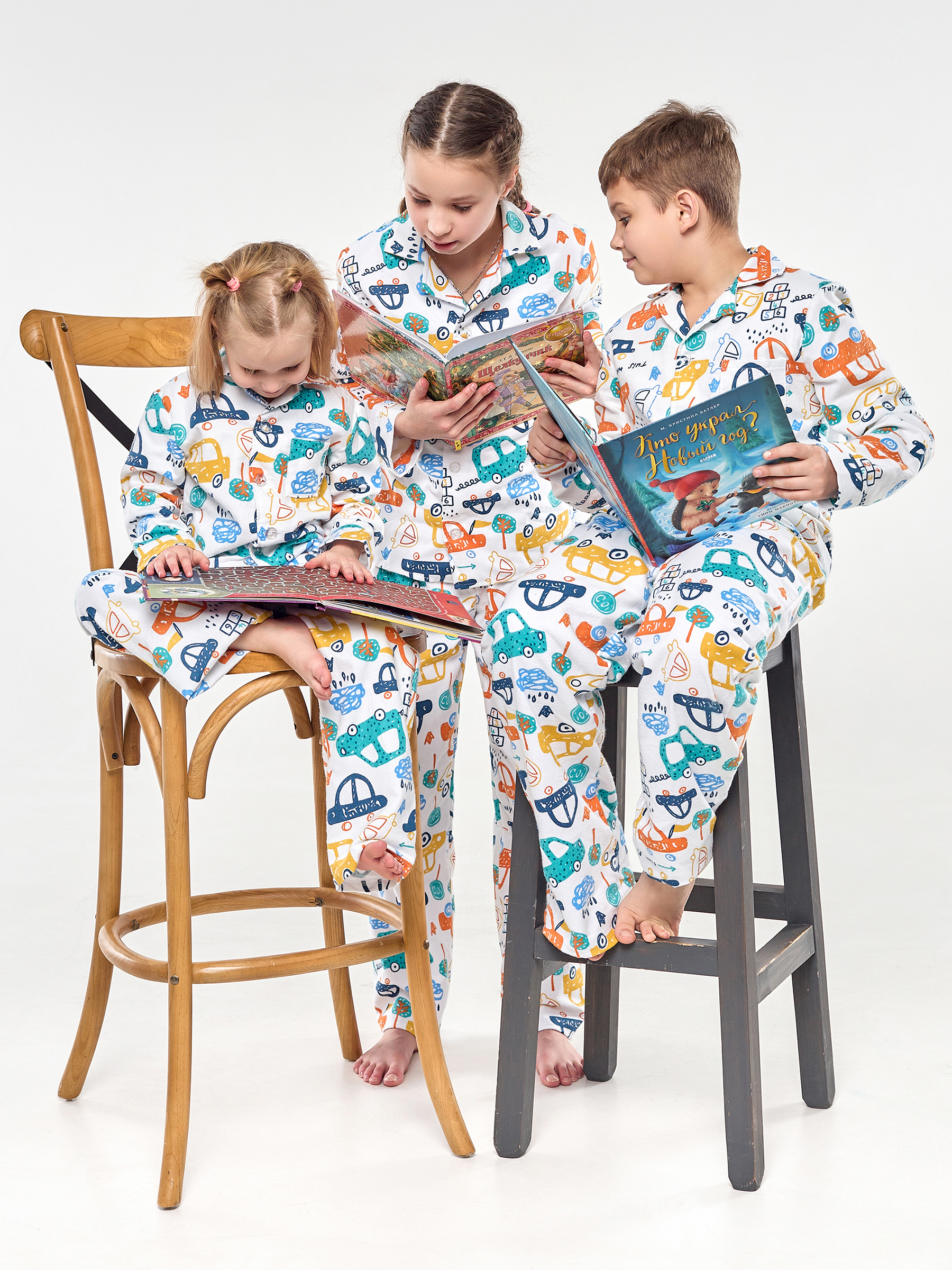 Пижама детская свободного кроя не будет стеснять движения во время активных, а также спокойных игр дома, состоит из длинных свободных штанов на резинке и рубашки с длинным рукавом на пуговицах.